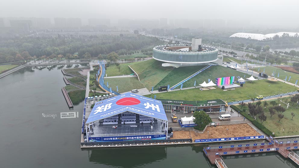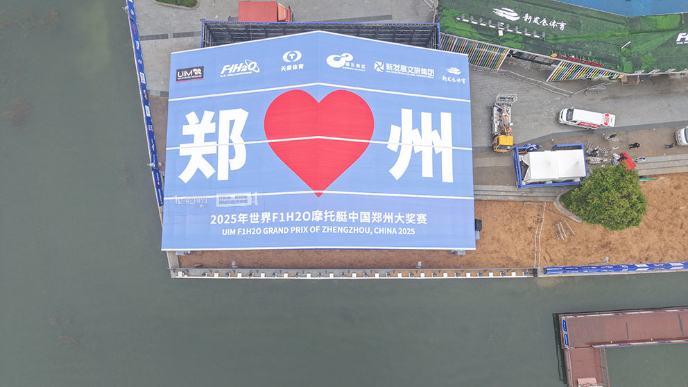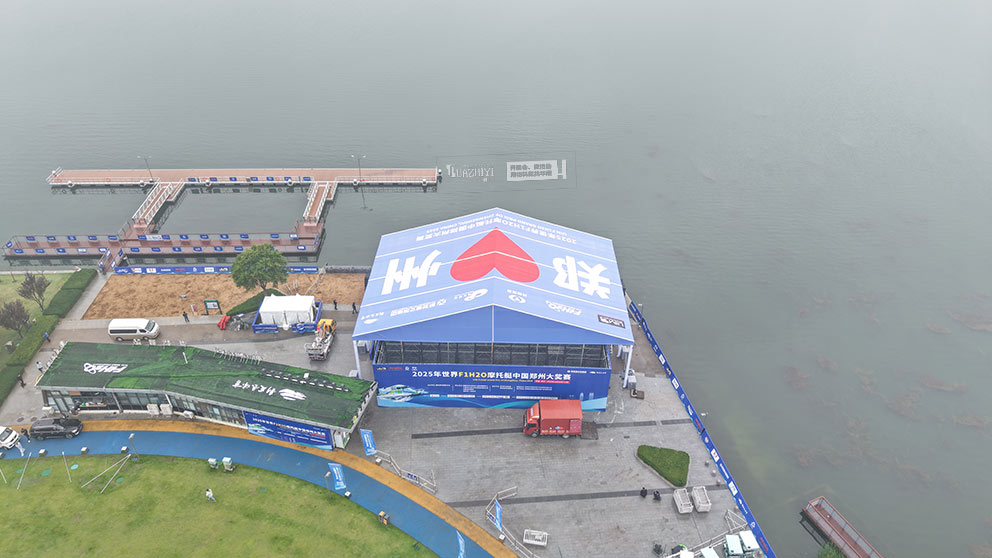 棚頂醒目位置印制了碩大的賽事全稱“2025年世界F1H2O摩托艇中國鄭州大獎賽”與“鄭州”字樣。篷房采用大跨度人字形結構,四周無篷布的開放式設計,讓篷房既保持通透開闊的視野,又能讓棚頂的賽事標識從各個角度清晰可見,成為賽場周邊極具辨識度的視覺焦點,向全球觀眾傳遞著鄭州承辦國際賽事的熱情與實力。