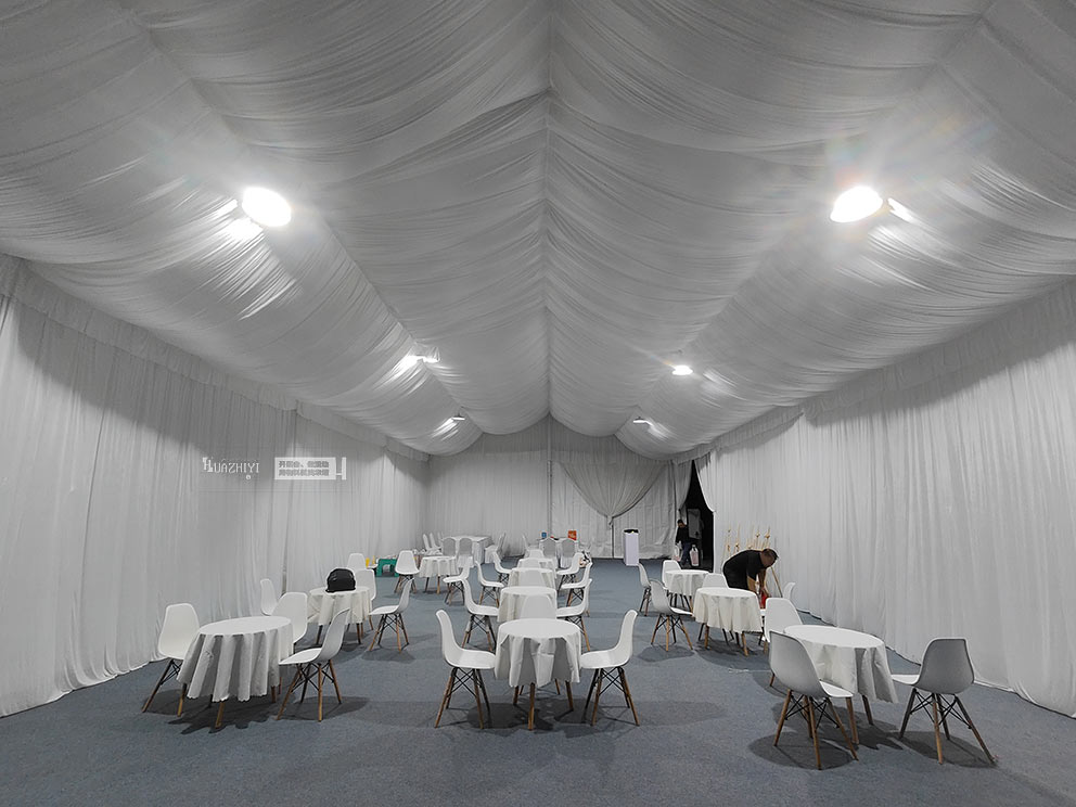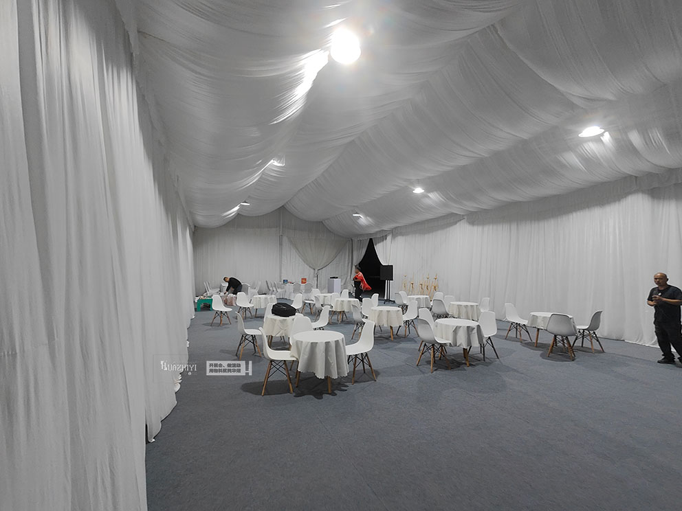 步入篷房,內部布置更顯精致。頂部懸掛的米白色帷幔層層疊疊,既劃分出功能區域,又增添了空間的縱深感。休息區擺放著駐馬店篷房出租公司的白色伊姆斯桌椅,圓潤的椅身包裹著細膩面料,坐感柔軟卻不失支撐;桌面鋪著同色系桌布,原木色桌腿則注入自然暖意,中和了白色調的清冷,讓科技感十足的試駕會多了份居家般的松弛。